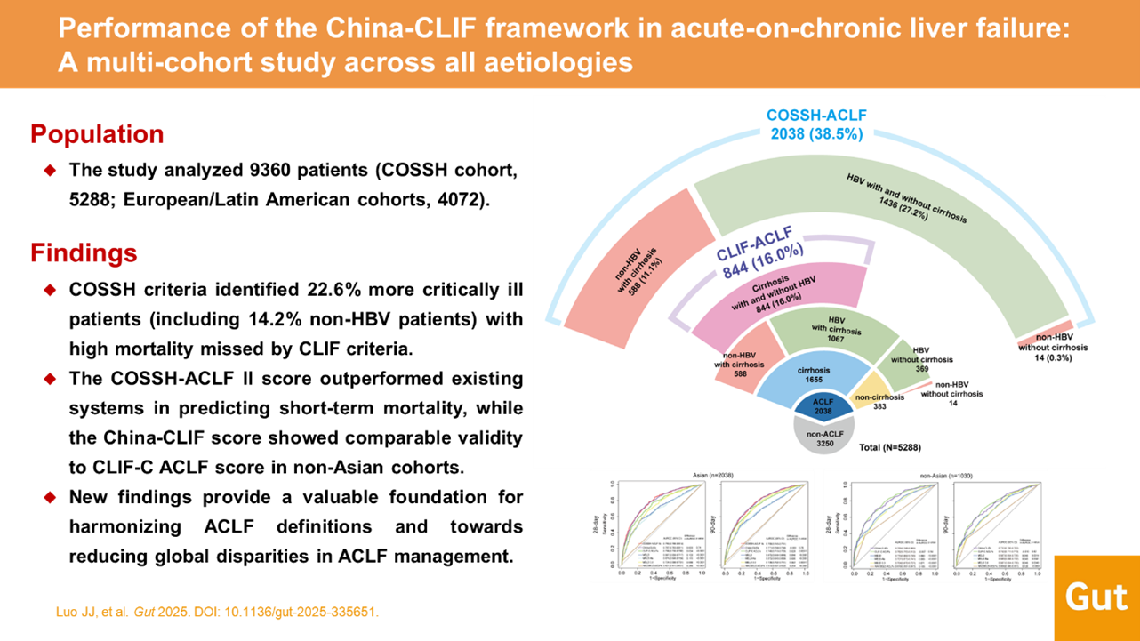 Building on this foundation, the team established the first prospective multicentre study cohort that included nearly all major ACLF aetiologies and collaborated with leading international cohorts. Their findings, recently published in Gut under the title “Performance of the China-CLIF framework in acute-on-chronic liver failure: a multicohort study across all aetiologies”, demonstrate that the China-CLIF framework offers broader applicability across diverse aetiologies and geographic regions compared with existing systems.